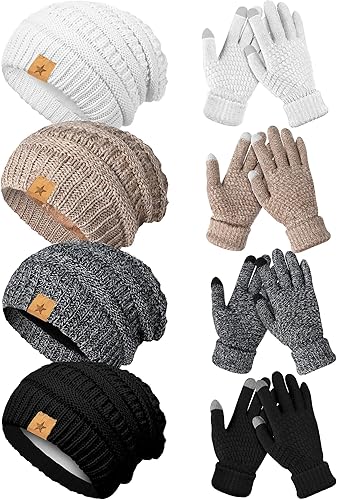 8 Pieces Women Winter Hats and Gloves Set Women Warm Gloves Touchscreen Knitted Lined Gloves Winter Beanies for Women